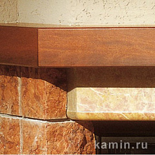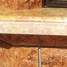 Боковые и цокольная части камина выполнены из золотистого натурального камня грубой обработки. Плита, архитрав и декоративная деталь над дровником - из желтого мрамора Reale. Деревянная балка из массива экзотического дерева.